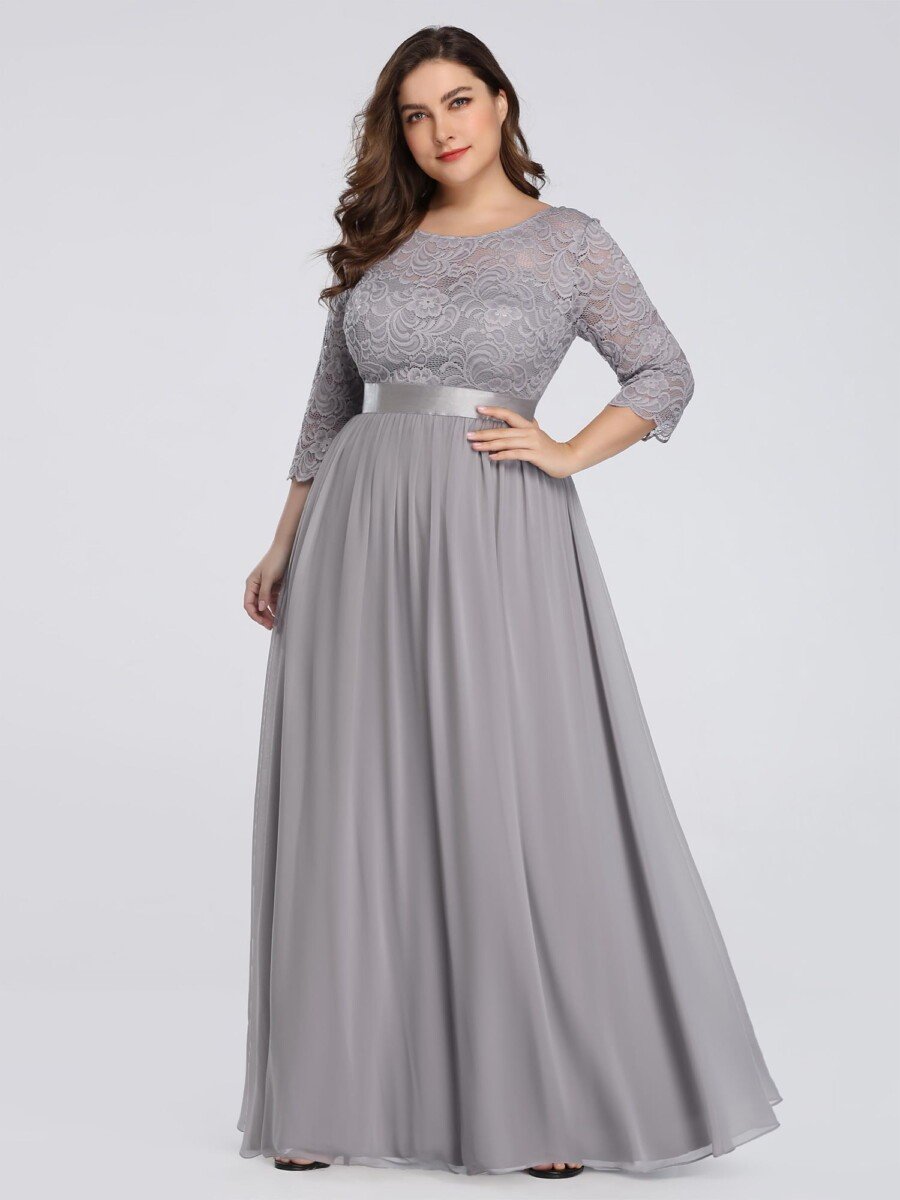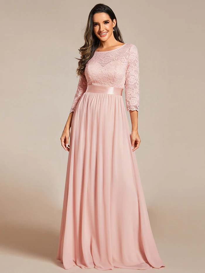 The lace bust and 3/4 lace sleeves add a romantic, feminine touch, for special celebrations.