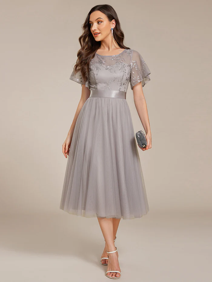 It features a round neckline and short sleeves, adding a delicate and feminine touch.