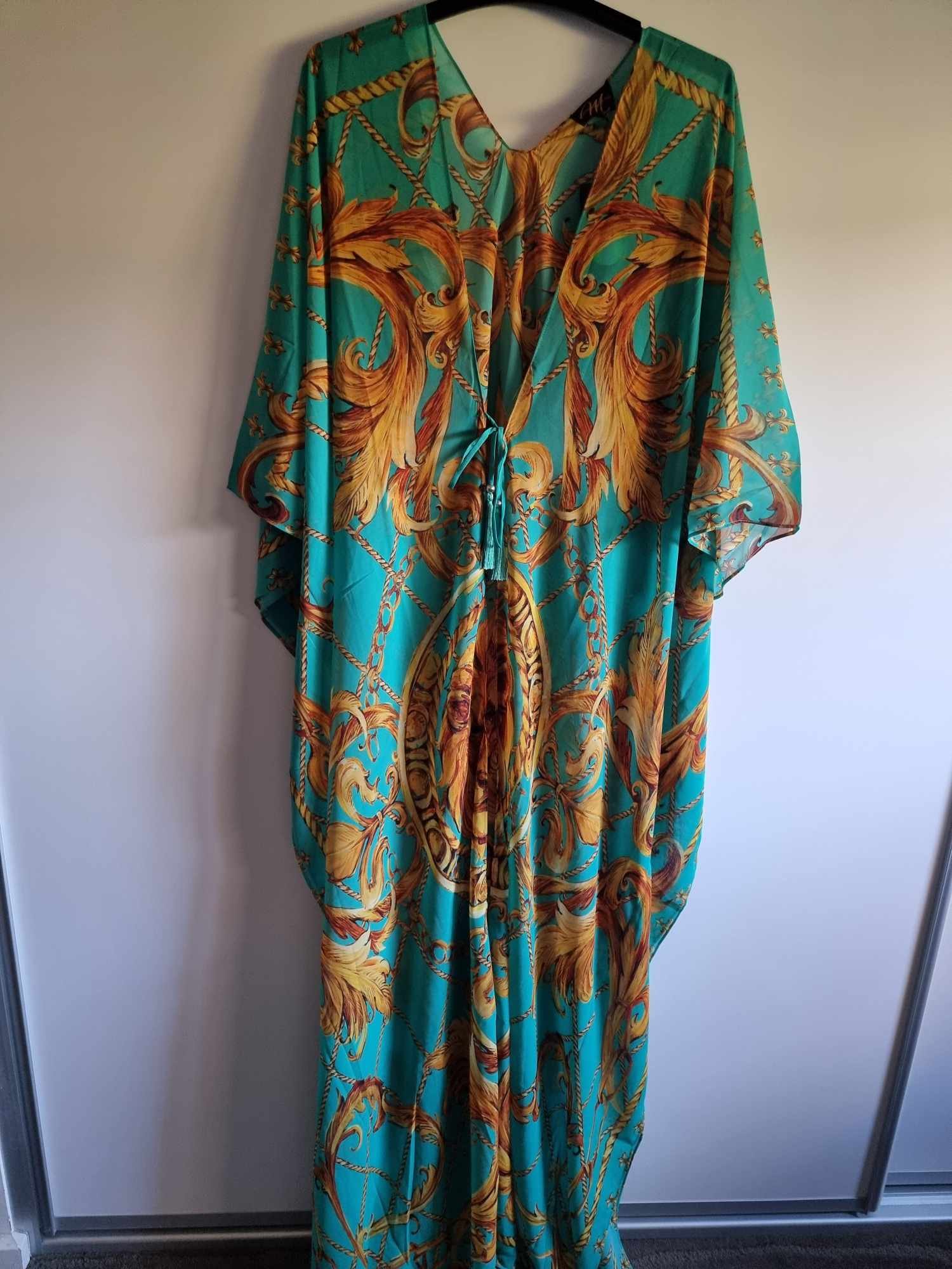 The full-length design exudes sophistication, while the gorgeous print throughout adds a vibrant and stylish flair.