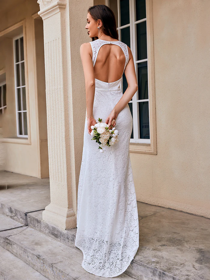 A backless design with a thigh split adds romance, and a concealed back zipper ensures ease.