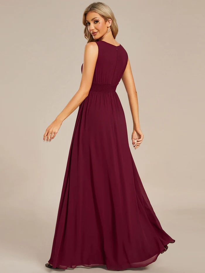 The soft pleated bodice and skirt create a graceful texture, adding depth and movement to the dress.
