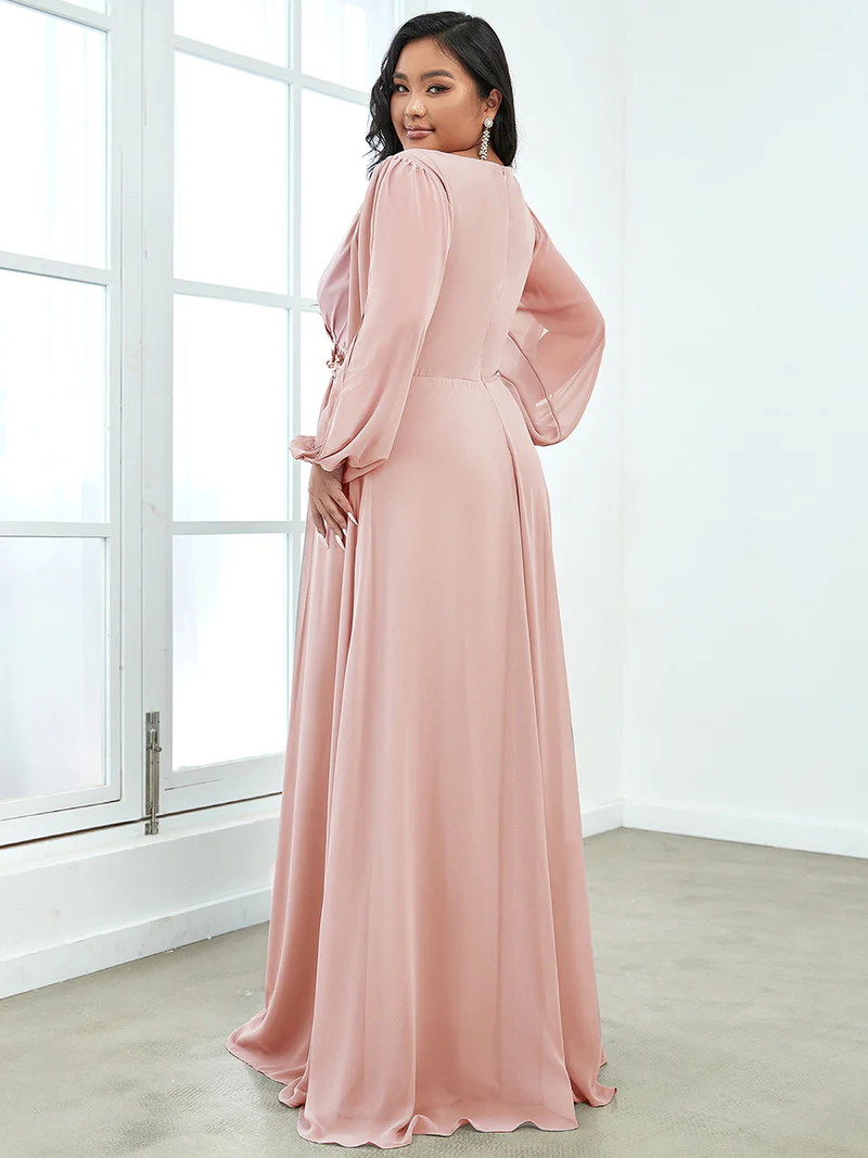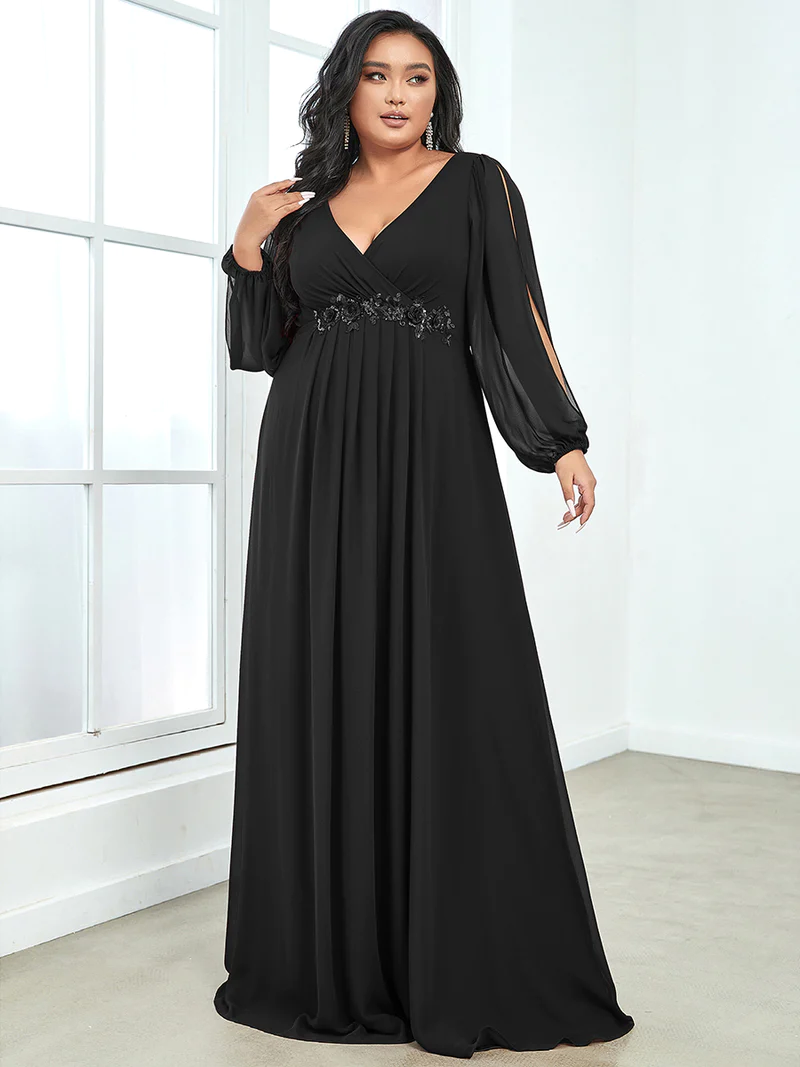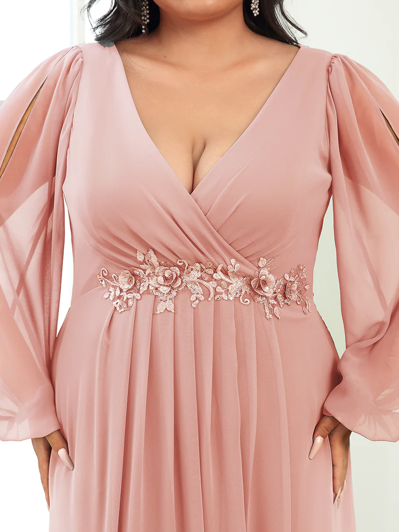 It features a flattering V-neckline and long sheer sleeves with a stylish split, adding a touch of elegance